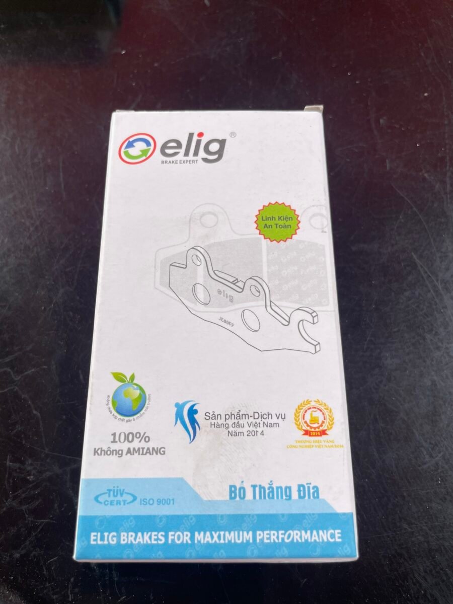 Với nguồn nguyên liệu tốt nhất được nhập khẩu từ các quốc gia và qua thử nghiệm bởi các trang thiết bị chính hãng Nhật Bản (tỷ lệ 1:1) về động thái, động lực và dị âm. Sản phẩm Bố thắng đĩa (phanh đĩa) xe máy Elig đã được công nhận đạt chuẩn yêu cầu thử nghiệm Mỹ, châu Âu, Nhật và bảo hiểm trách nhiệm sản phẩm toàn cầu giá trị 1.000.000 USD.